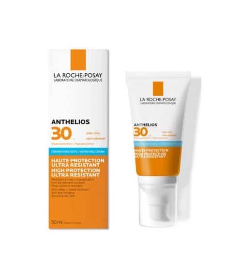 - Les produits de protection solaire ANTHELIOS sont enrichis à l’eau thermale La Roche-Posay. Cette eau unique, particulièrement efficace contre les dommages cutanés qui peuvent être induits par des rayons UVA-UVB, possède des propriétés apaisantes et anti-oxydantes.